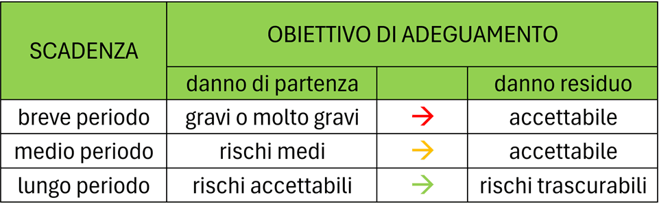 - medio periodo: attuare quelle misure, a priorità più contenuta, necessarie per ricondurre i rischi medi entro un livello di rischio accettabile;